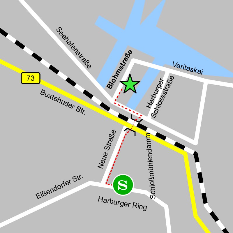 From Autobahn A1: take exit #38 ("Hamburg Harburg"). Keep on straight ahead, passing "Veritaskai" with its drawbridges, until the end of the street. Follow the main road to the left and you have reached "Blohmstraße". |